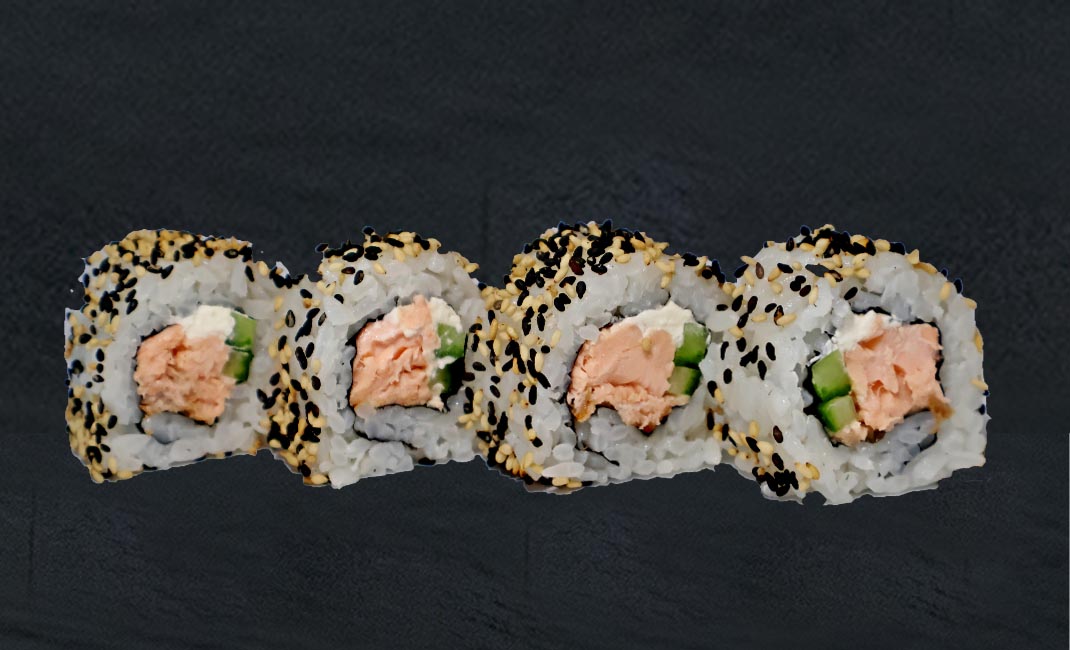 Ориз, нори, краставица, филаделфия,печена сьомга,сусам микс, джинджифил, уасаби