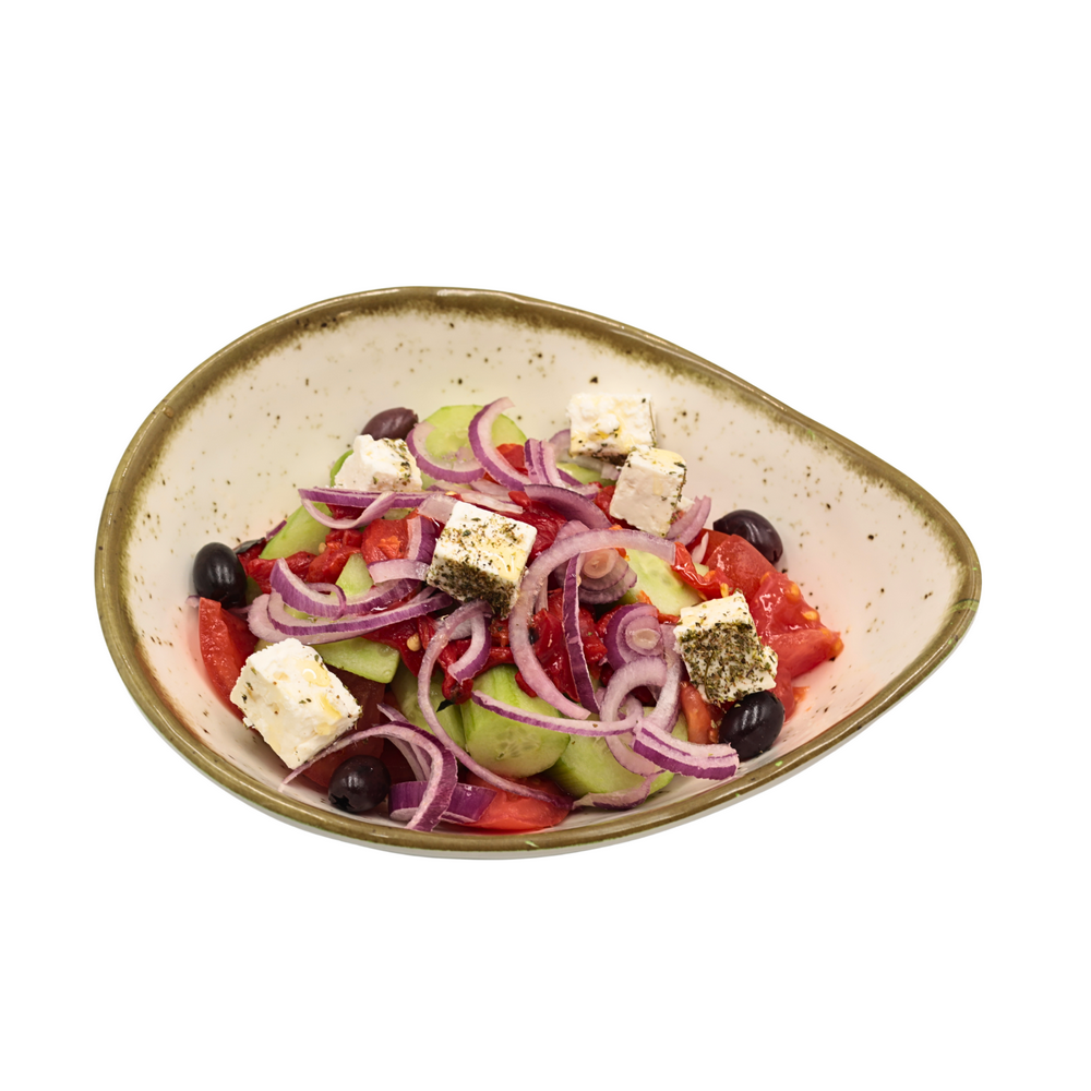 Домати, краставици, лук, печени чушки, маслини, мариновано сирене