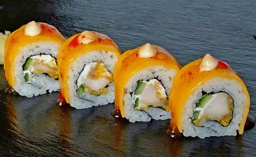 Ориз, нори, краставица, филаделфия,хрупкаво пиле,чедър,японска майонеза,сладко чили, джинджифил, уасаби
