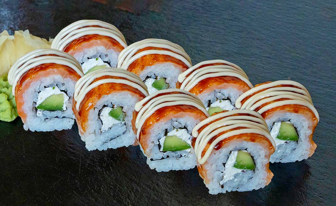 Ориз, нори, авокадо, филаделфия,запечен тон,сос унаги,шрирача,японска майонеза, джинджифил, уасаби