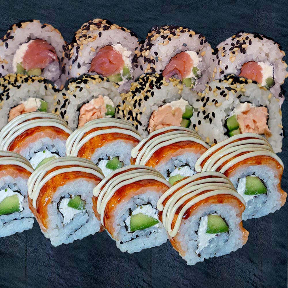 Сьомга джъмбо рол 8бр. , Филаделфия печена сьомга 4бр. , Филаделфия пушена сьомга 4бр. , джинджифил,уасаби
