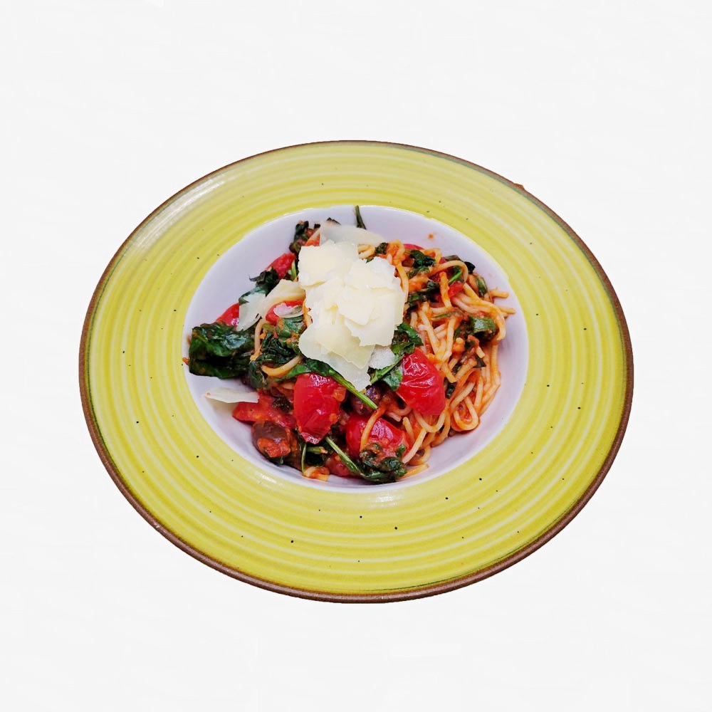 Спагети с чери домати, маслини и спанак