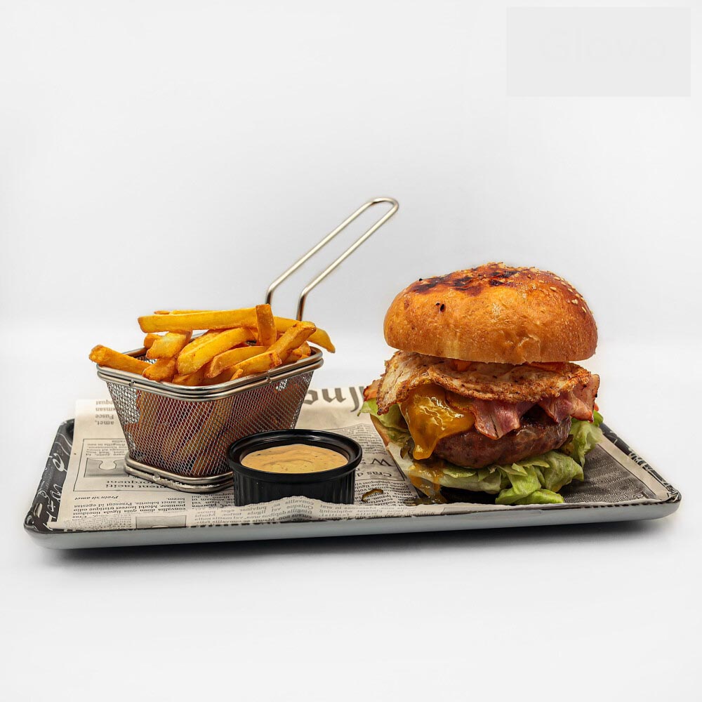 домашен бриош, телешко кюфте айсберг, домат, чедър, бекон,яйце, карамелизиран лук, кисели краставички, гурме бургер сос и пържени картофки
