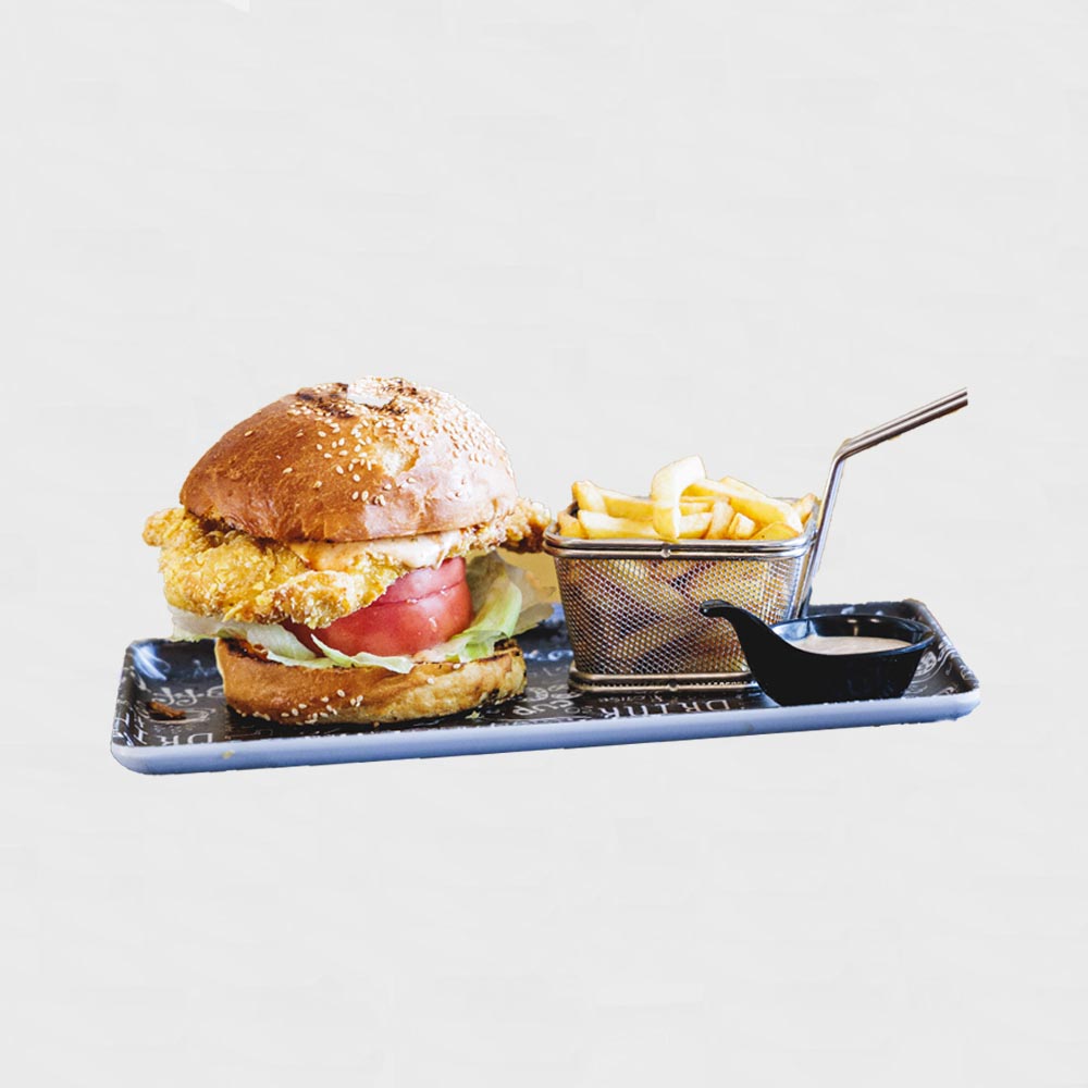 домашен бриош с хрупкаво пиле, гурме бургер сос, айсберг, домат, краставици и пържени картофки