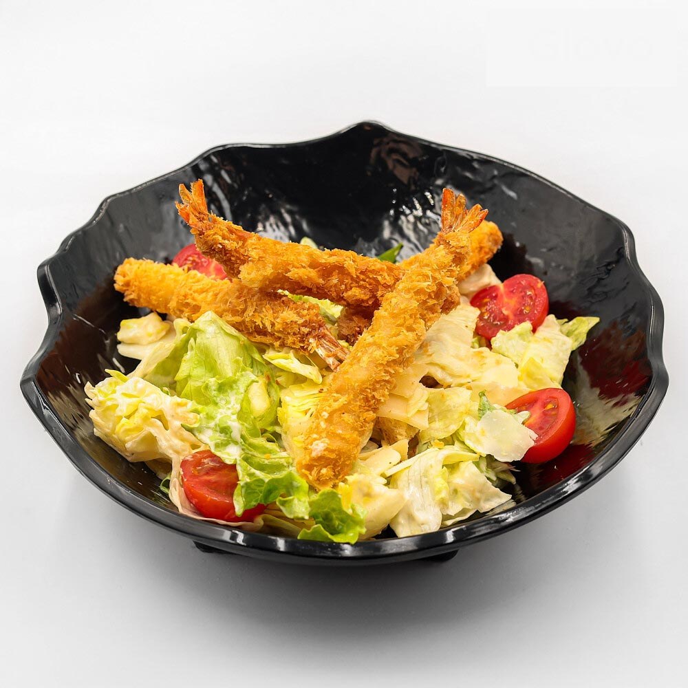 Айсберг, зелена салата, скариди, чери домати, пармезан и сос цезар