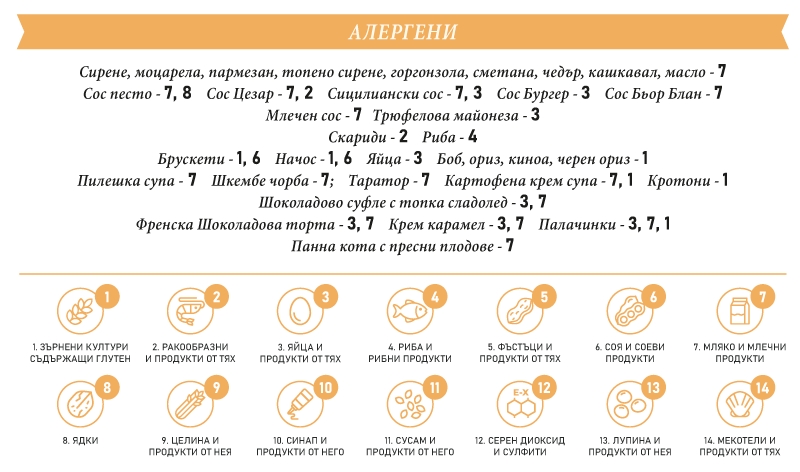 * Моля, консултирайте се с персонала при наличие на алергии или непоносимости. Всички ястия могат да съдържат следи от алергени.