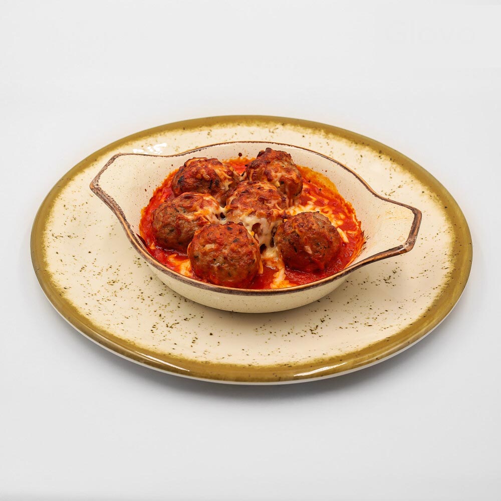 Телешки кюфтенца във доматен сос запечени с кашкавал и пармезан