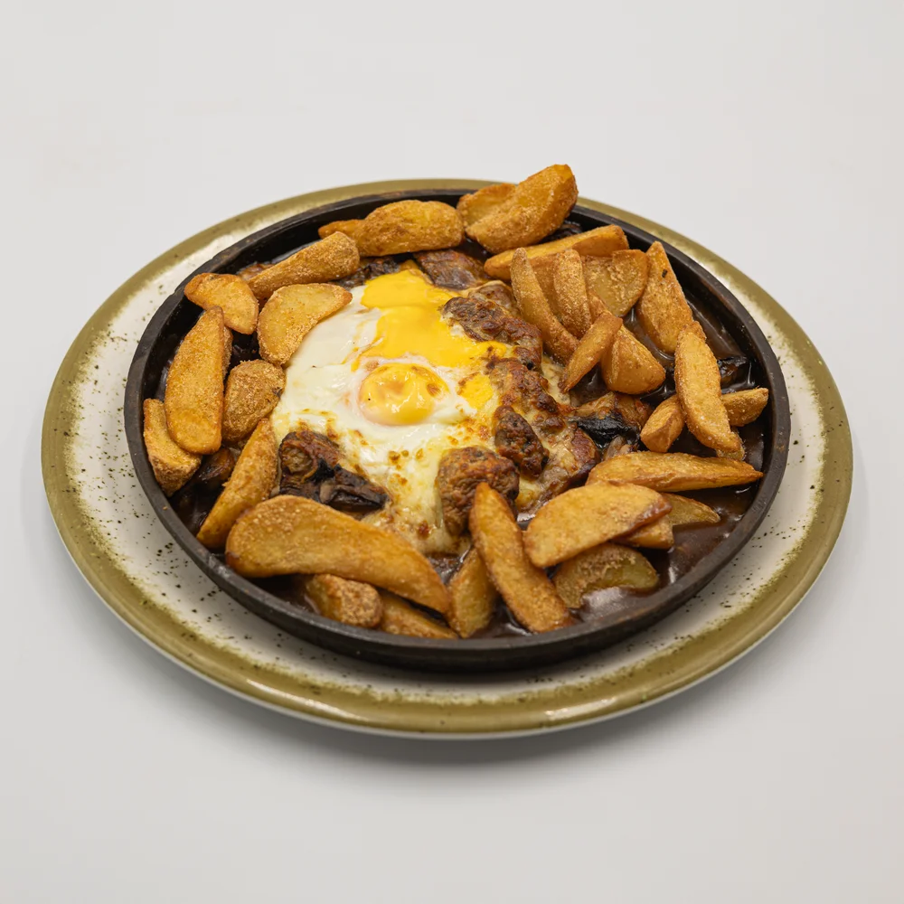 свинско бон филе, гъби, печен сос, запечено с кашкавал и яйце и пикантни картофки