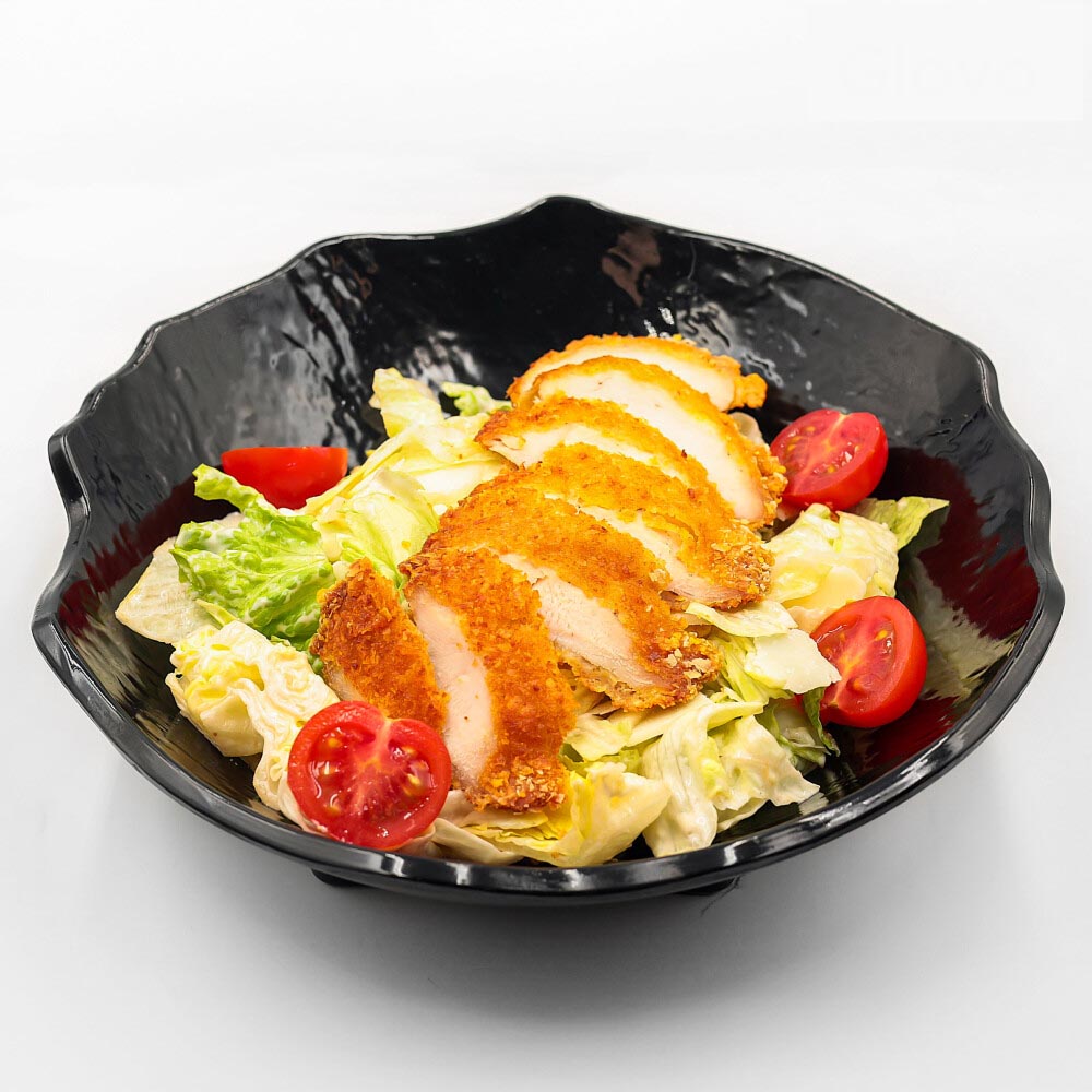 Айсберг, зелена салата, чери домати, пилешко филе, крутони, сос цезар и пармезан