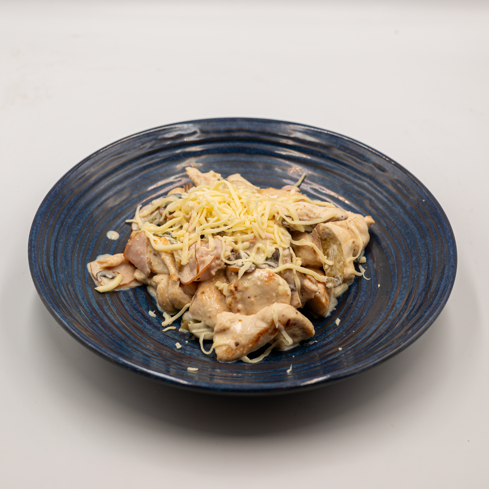 пилешки късчета, гъби, кисели краставички, шунка, и кашкавал